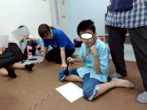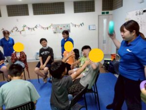 ②の部屋では、「爆弾ゲーム」を行いました!今回は爆発することに色々な変化が起き、爆弾の進む向きが変わったり、個数が変わったり、音楽を止める人が変わったり!そんな変化を楽しむ児童たちの姿をどうぞ!