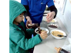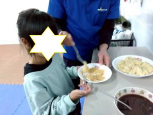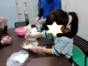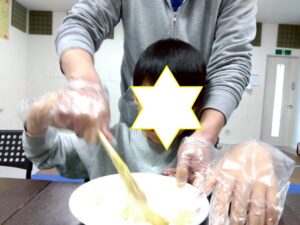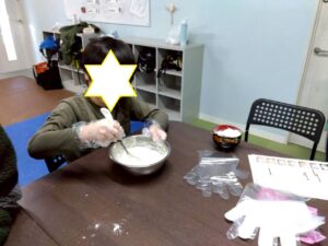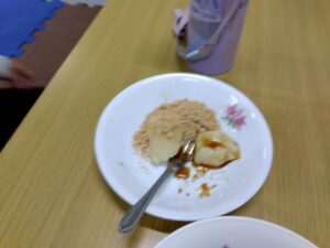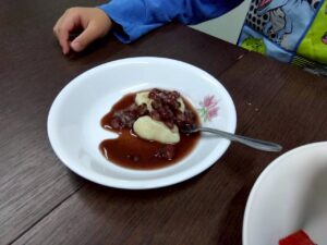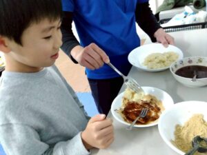 第二は『お豆腐でお餅を作ろう』です。お豆腐を砕いて片栗粉と一緒に混ぜ込みます。まあるい形や自分の好きな形にしてレンジでふやかせば、立派なお餅の出来上がり。好きなトッピングをしてふかふかをいただきま~す。