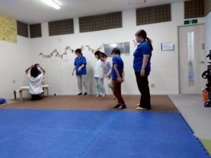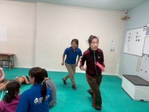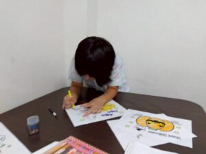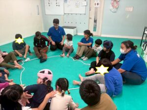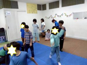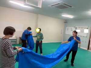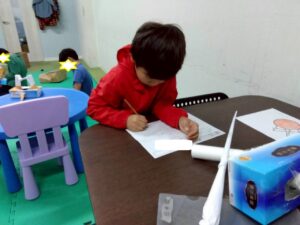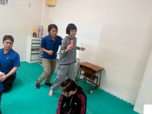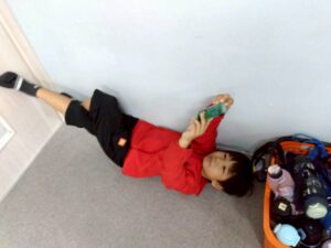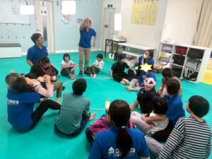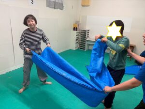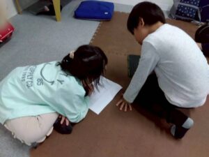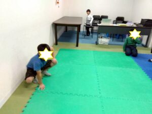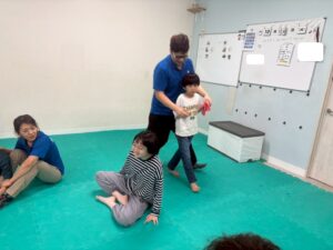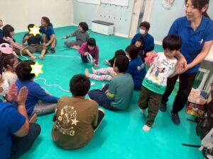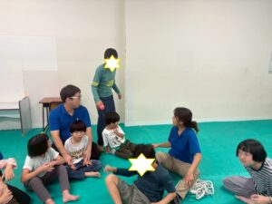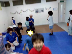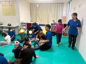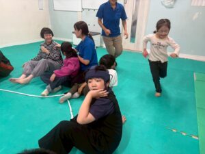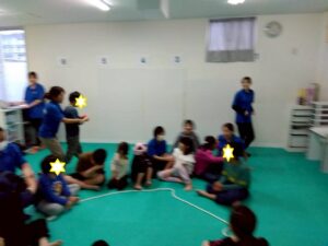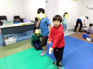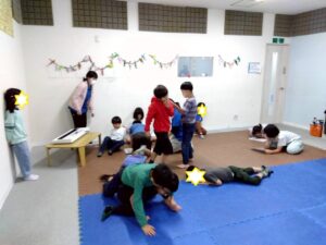 今日は第一『運動遊び』そして第二は『リトミック』です。急に涼しくなってきて、体調管理が大変なのは大人だけ。子どもたちはいつでも元気。お友達の背中にタオルを落として、今度はその人が走ります。身体を動かし笑顔の第一は運動の秋。音楽に合わせて歌を歌ったり身体を動かしたりの第二のお部屋は芸術の秋ですね。