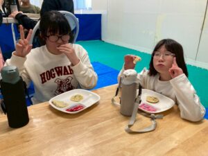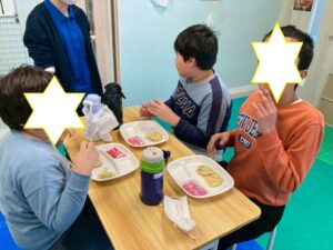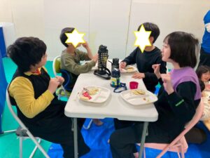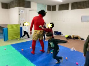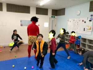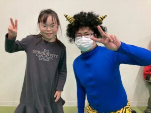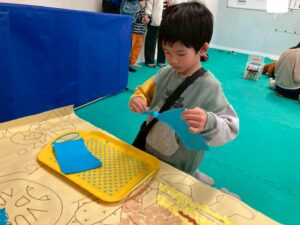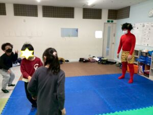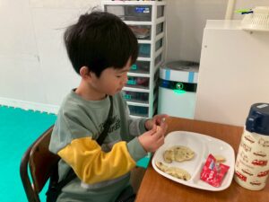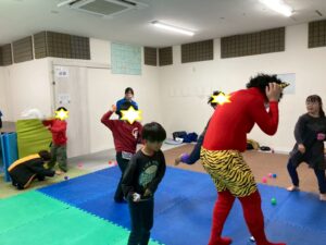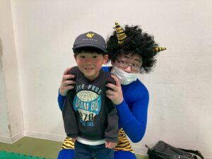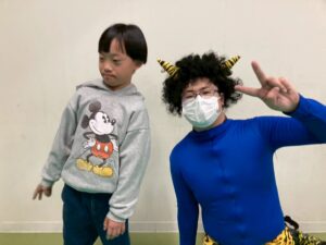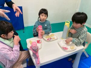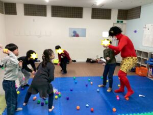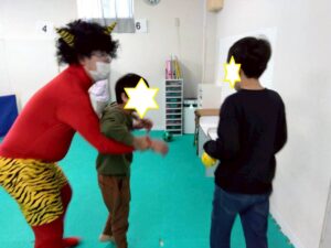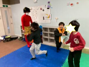 第一のお部屋でちぎちぎ、ペタペタ壁面工作をしていると、鬼が入ってきました。それ!豆をぶつけてやっつけろ。鬼は病気などの『悪いこと』の化身です。鬼に豆をぶつけて流行しているインフルエンザもやっつけろ!第二のお部屋でも鬼を追いかけて豆をぶつけて大盛り上がり。みんなの元気におされて鬼はすごすごと退散です。おやつには鬼まんじゅうも食べました。