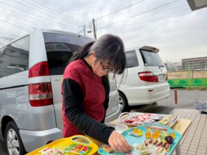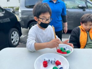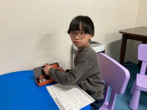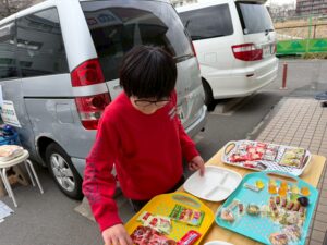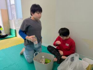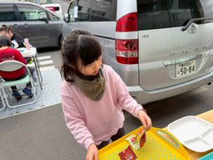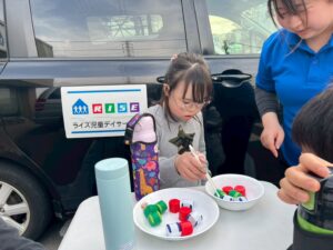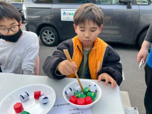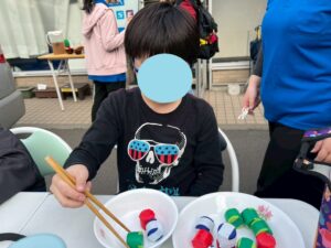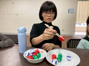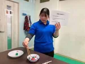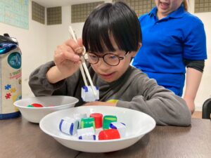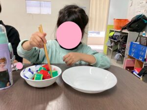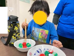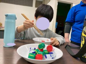 今日はお箸を使ってペットボトルキャップを掴み、お皿に移すゲームを行いました。