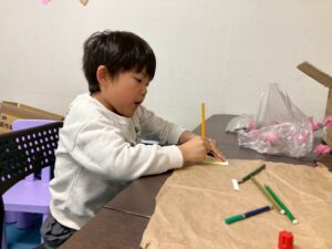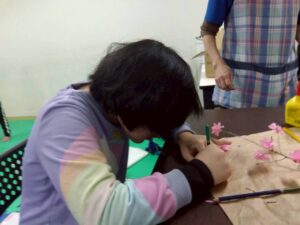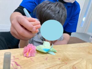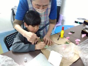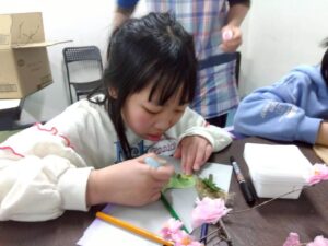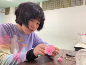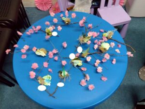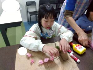 子どもたちは、お花紙を使って桜の花を作ったり、枝に乗せる鳥のイラストを色えんぴつで塗り