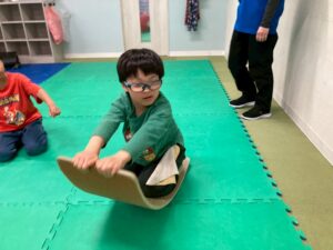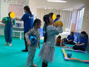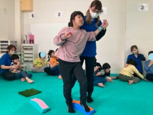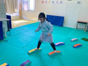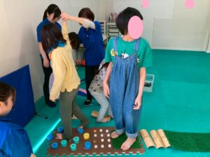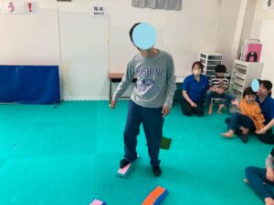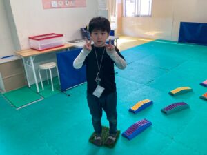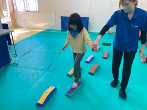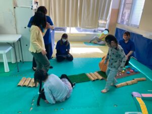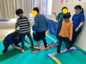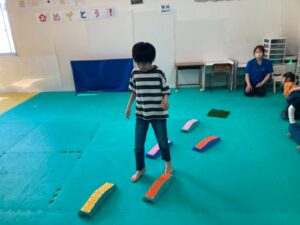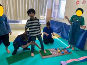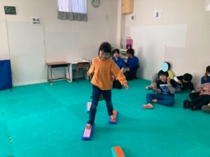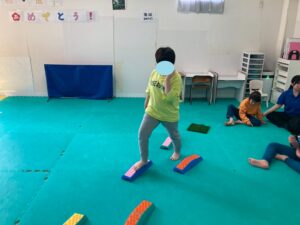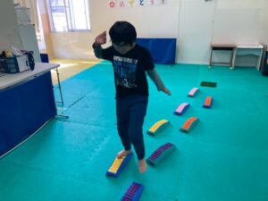 本日訓練室①では「感覚遊び」を行いました。今回のターゲットは足の裏の感覚と平衡感覚!デコボコ平均台でサーキットコースを作りみんなで順々にレッツチャレンジ!そんな児童たちの姿をどうぞ!