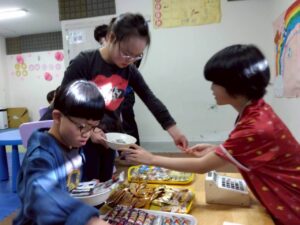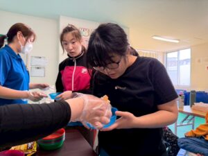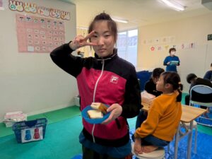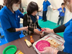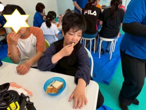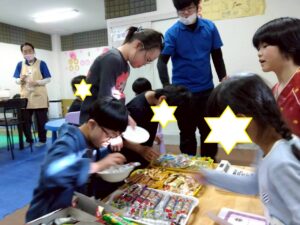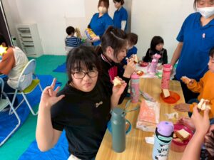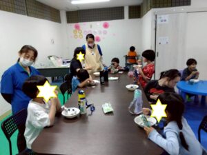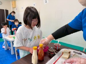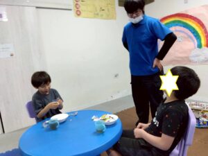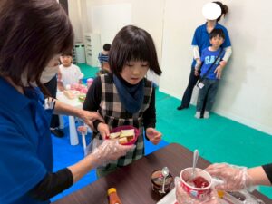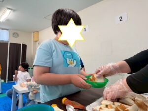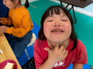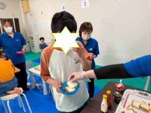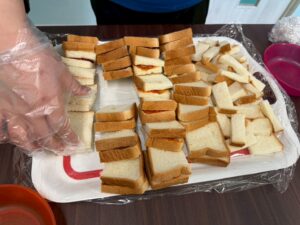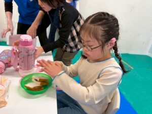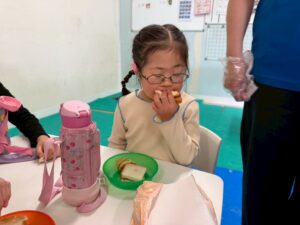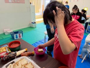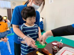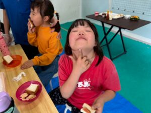 今日の第一は『サンドウィッチ』です。パンにサンドするのはピザソ-スやコーンマヨ、甘いのが好きな子にはあんこやイチゴジャムも挟みましょう。美味しそうなサンドウイッチが勢ぞろい。どれにしようかな。えい。めんどうだから全部食べちゃえっていう猛者も内緒だけど少数…。わいわい楽しい時間です。