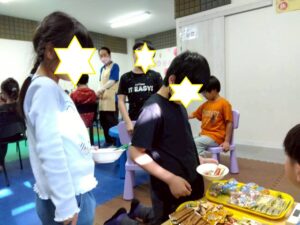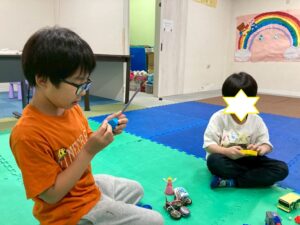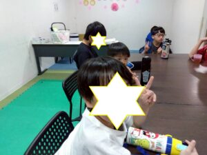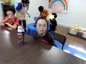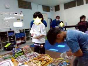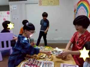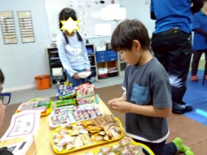 第二の『お買い物学習』は、¥100で買えるお菓子を選びます。¥20とか¥30とか値段の表示の前で思案顔。『これを買うとあれが買えない…』『これを3つ買うとあれが買えないから2つにしとこう』嬉しい悩みの表情です。こちらも盛り上がりました。