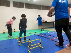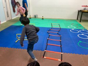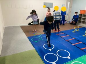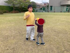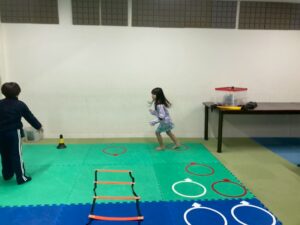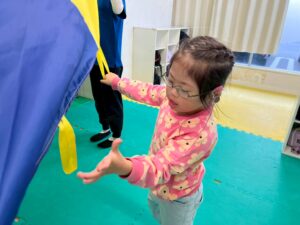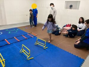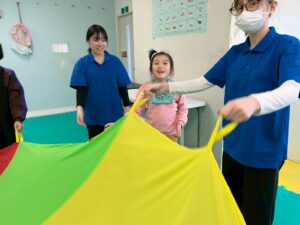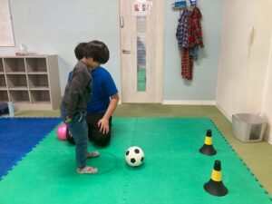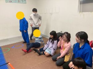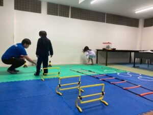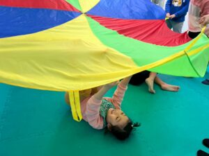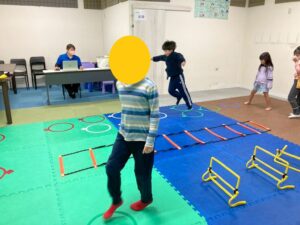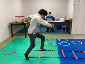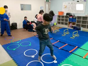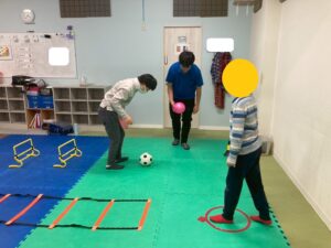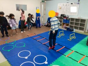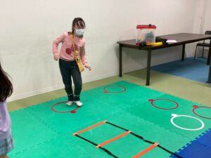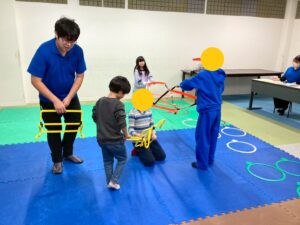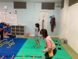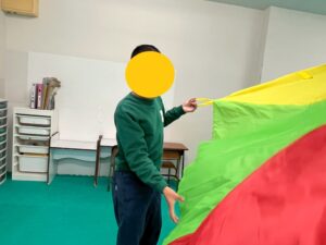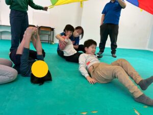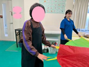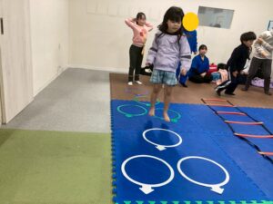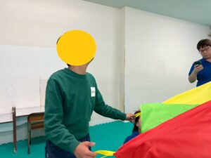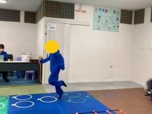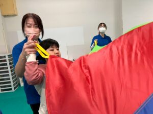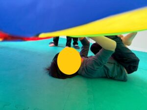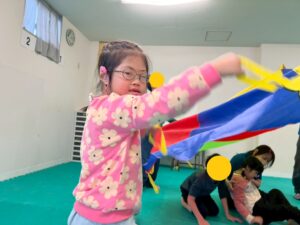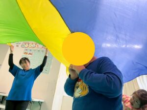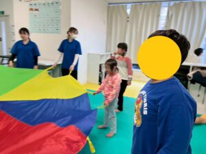 本日は訓練室①➁両方の訓練室で「リトミック」!内容は訓練室①では「パラバルーン」を訓練室➁では「サーキット運動」を行いました!