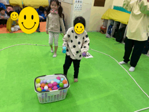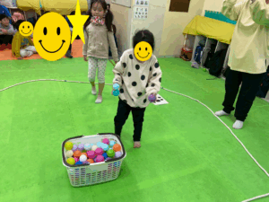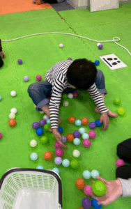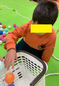 ボールを服に乗せたり、ショベルカーのように腕で持ったりとそれぞれカゴに入れる工夫がありました✨