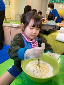 卵の殻が入らないように割ったり、牛乳を測ったりお友だちがどのようにやっているのか興味津々に見ていることもありました。