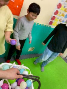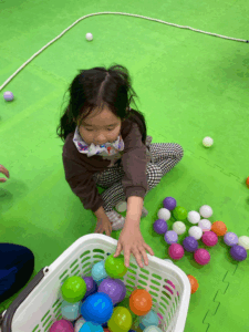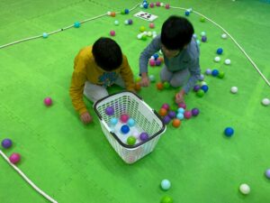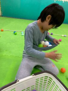 ボールを服に乗せたり、ショベルカーのように腕で持ったりとそれぞれカゴに入れる工夫がありました✨
