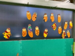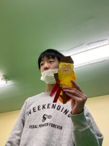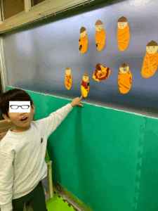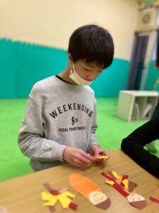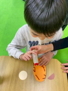お友だちにはミノムシの顔の表情と帽子をつけてもらい、体に毛糸を巻くチームと画用紙を貼ってもらうチームに分けました。