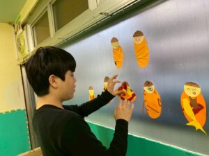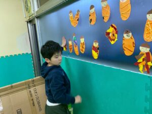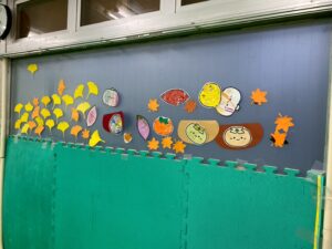 窓の半分が寂しいので自由時間に作ってもらったくだものや野菜たちも窓に貼ってみよう!