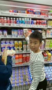 「先生何買うの?」と、ホットケーキの粉、牛乳、たまごと、伝えると店内を探して「あった!どれにしようか?」と相談している場面もありました。