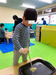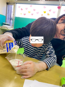 卵の殻が入らないように割ったり、牛乳を測ったりお友だちがどのようにやっているのか興味津々に見ていることもありました。