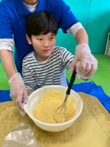 お友だちが材料の確認をしながら混ぜ合わせていくよ。