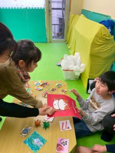 フリーマーケットはお客さんとお店屋さんに分かれて販売を遊びながら経験します。