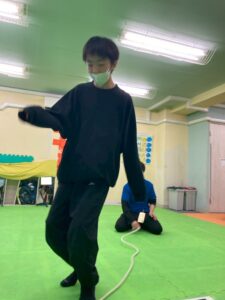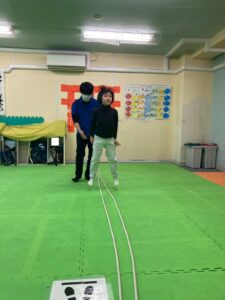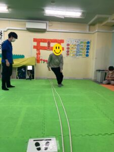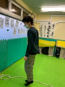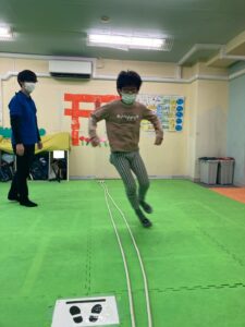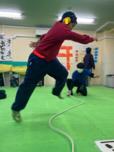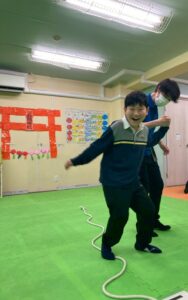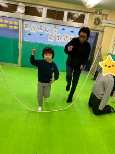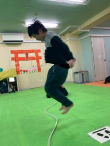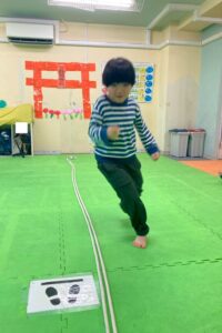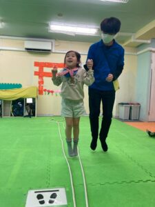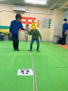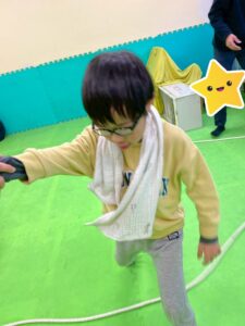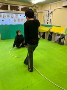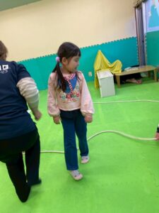 縄を跳ぶ、跨ぐ、くぐるなどを通して粗大運動を中心に取り組みました。